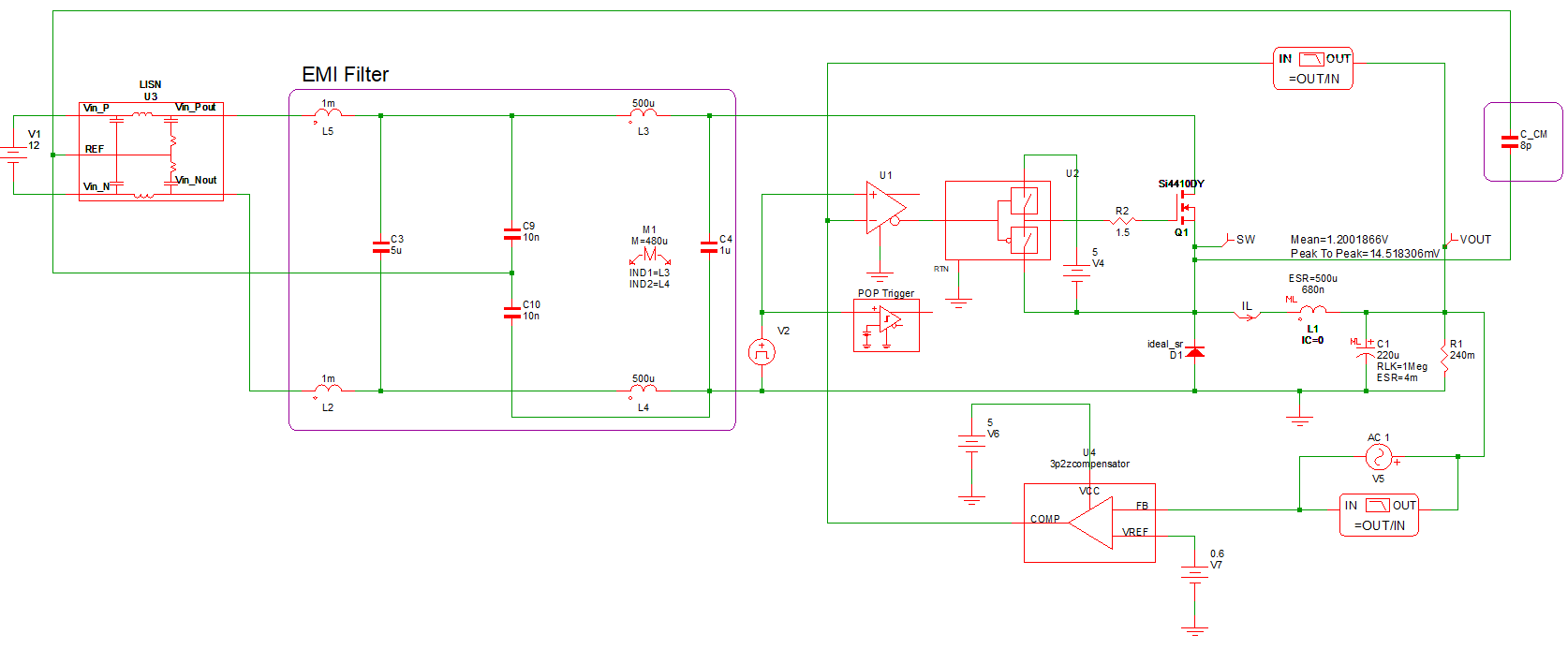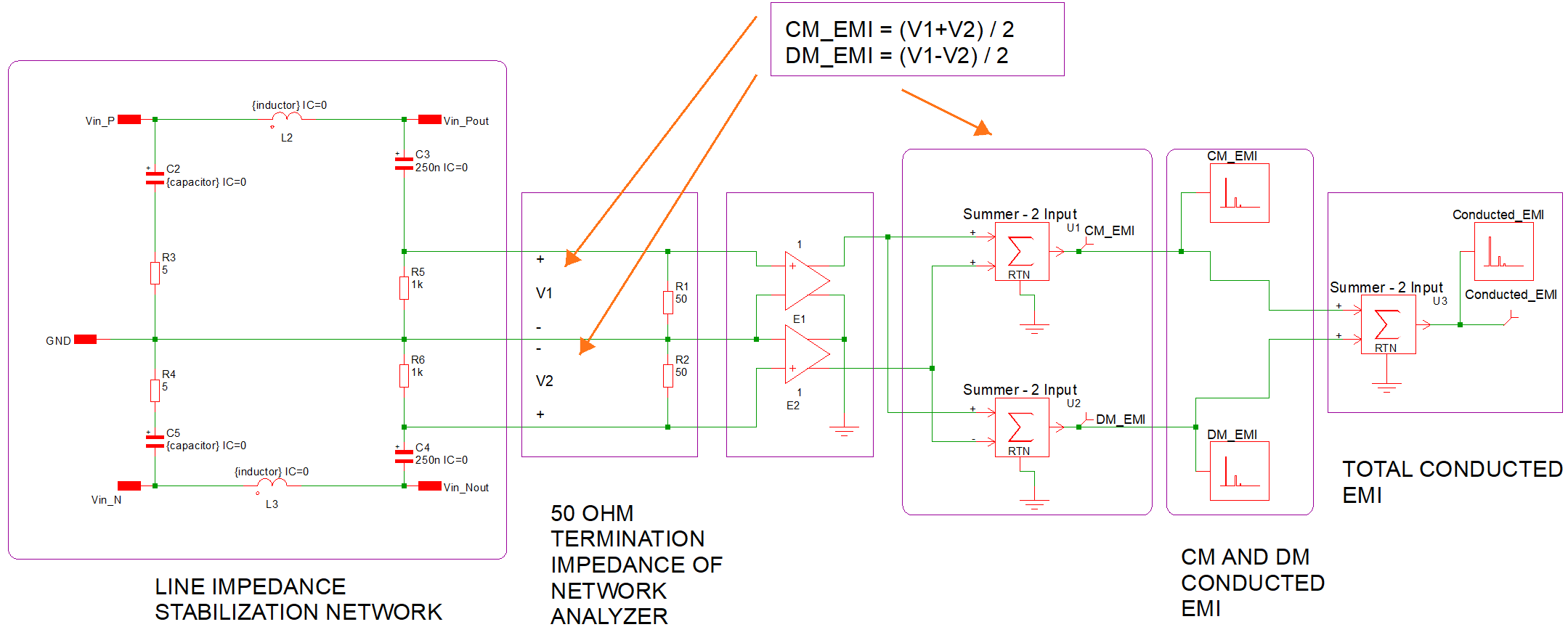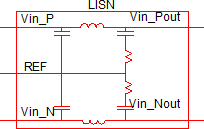 A Line Impedance Stabilization Network (LISN) is a device placed between equipment under test (e.g. a power supply, or a larger system containing a power supply), and an AC or DC power source to create a known precise impedance to the power input of the equipment under test (EUT) and to provide a port for measuring electromagnetic interference (EMI). In addition to the actual LCR stabilization network, the LISN device available in SIMPLIS also includes embedded voltage and Fourier probes that measure differential mode (DM), common mode (CM), and total conducted EMI. Additionally, the LISN device can be configured to plot emission limits defined by different EMI emission standards on the same graph as the measured conducted EMI. This allows for the quick testing of whether the EUT (i.e. the converter circuit in the schematic) meets the required conducted EMI specifications.