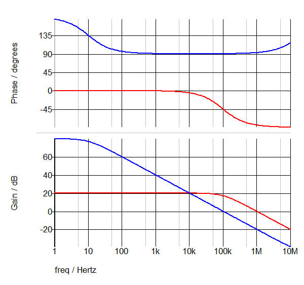 The opamp is configured as a non-inverting gain of 20dB. With an open loop gain of 100 dB and a Gain crossover frequency of 1MHz, the overall gain of the opamp is 20dB at low frequencies, with a pole at 100kHz, and a 1MHz unity gain crossover frequency. The loop gain pictured in blue has the expected maximum of 80dB and the unity gain crossover frequency is 1MHz.