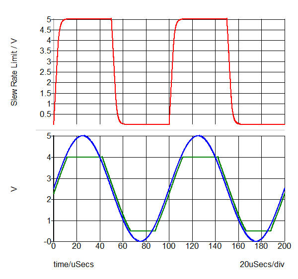 The slew rate limited behavior of the opamp is shown on the upper axis. This opamp has the positive and negative headroom set to 0V, meaning the output can swing from rail-to-rail which in this circuit is 0 to 5V.