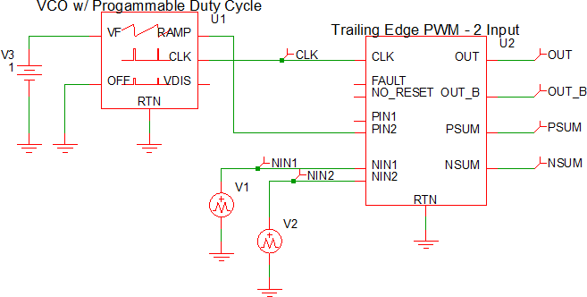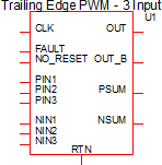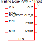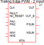 The Trailing Edge PWM block sums all positive inputs ( PIN1, PIN2, ...) and outputs that sum on the PSUM pin. Similarly, all negative inputs are summed and output on the NSUM pin. The output signal, OUT is high when PSUM is greater than NSUM, except during the interval when the clock signal is high in which case OUT is forced low.
