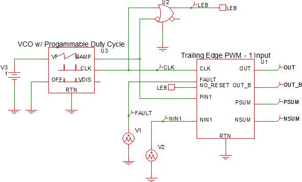 The Trailing Edge PWM block is a general purpose PWM block with leading-edge blanking, a fault signal, and a toggle Flip-Flop option. This block does NOT contain an oscillator; instead, you can use your own oscillator or one of the built-in oscillator models: