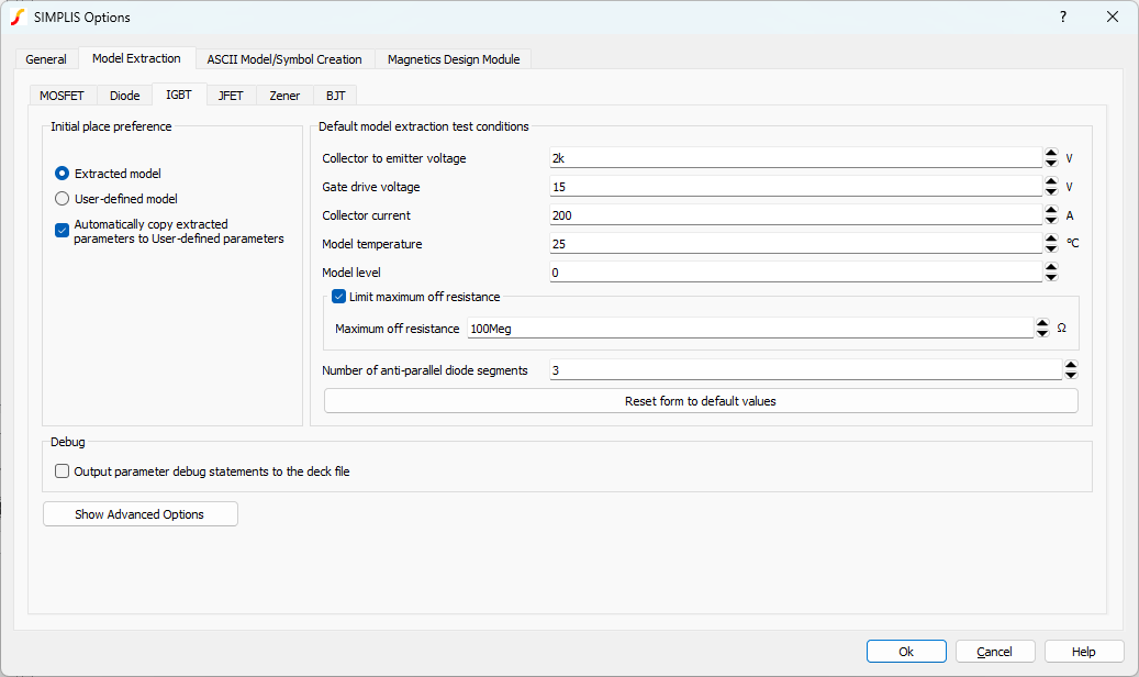 | Limit maximum off resistance | Checked | none | Limits the off resistance for the IGBT. For some SPICE models, this will produce a SIMPLIS model which runs faster. |