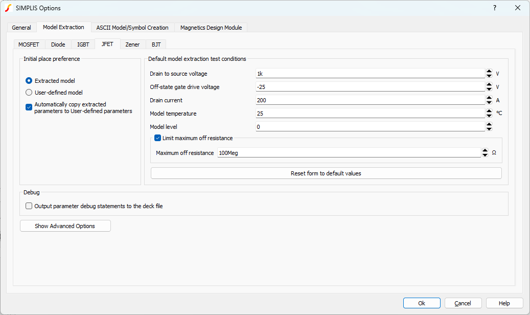The default test conditions for the Extract JFET Parameters dialog can be set from the menu Three advanced options are hidden by default until you click the Show Advanced Options button.