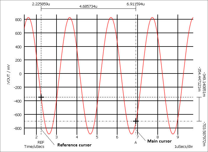Graph cursors can be used to make measurements from waveforms. In their default configuration they consist of two dimensioned crosshairs as shown below: