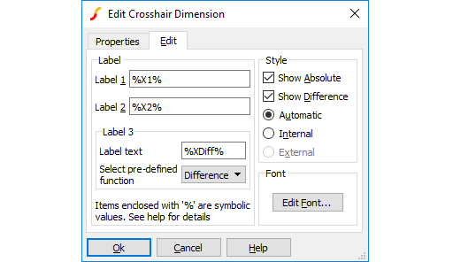 Label The labels are the three values displayed on the dimension. Label 1 is the value displayed above the reference cursor, label 2 is the value displayed above the main cursor and label 3 is the value displayed as the difference. %x1%, %x2% and %xdiff% are symbolic values that will be substituted with the absolute position of the reference cursor, the absolute position of the main cursor and the difference between them respectively. You can add additional text to these. For example, if you changed label 1 to 'Pulse Start = %x1%' the value displayed for the position of the reference cursor would be prefixed with 'Pulse Start = '.