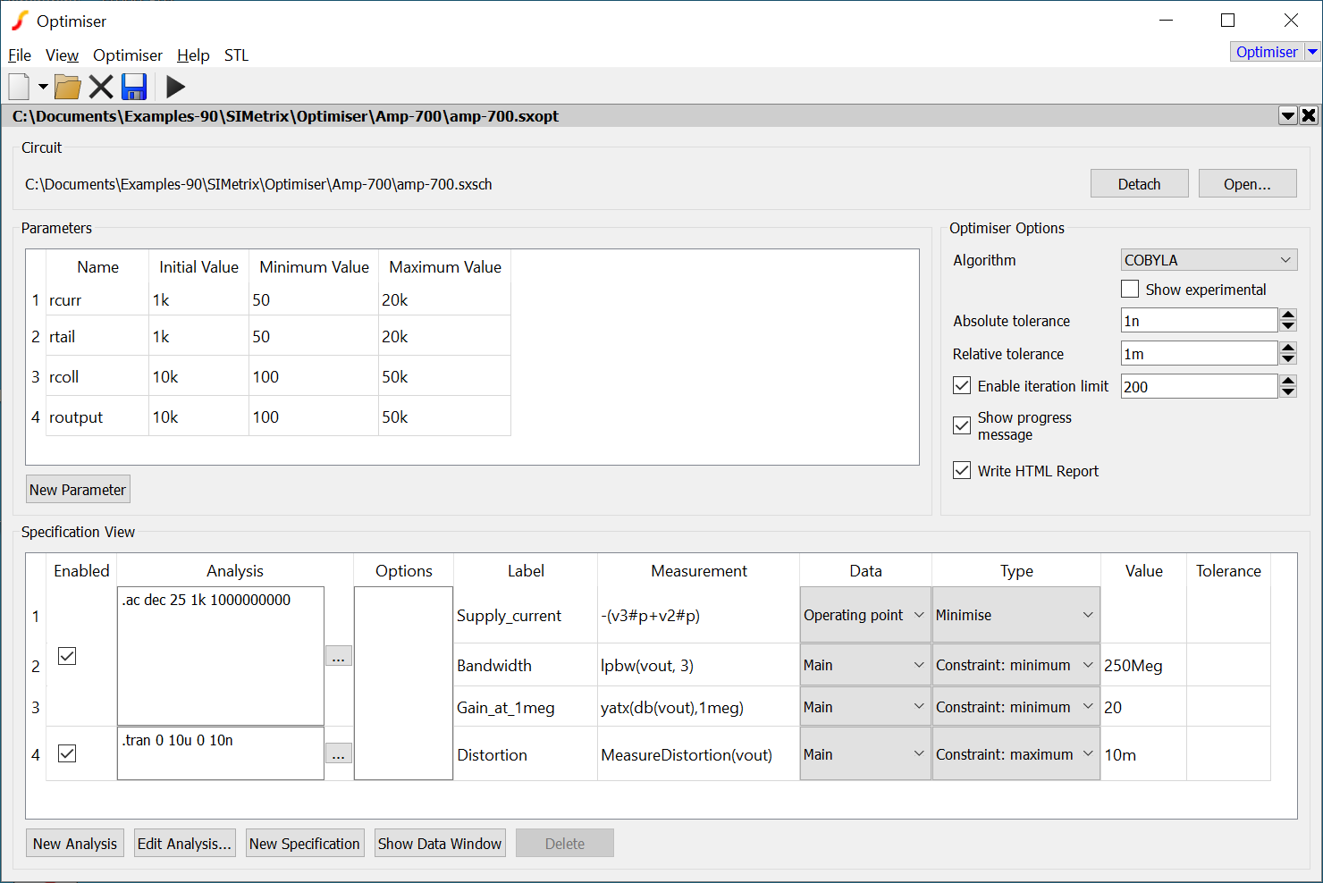 From the examples folder locate the file amp-700.sxopt. Typically this will be located at Documents/SIMetrix/Examples-version/SIMetrix/Optimiser/Amp-700/amp-700.sxopt. You can drag and drop the file into the SIMetrix environment or open it using menu then select Optimiser Files (*.sxopt) in the file selection drop down box then navigate to amp-700.sxopt. You should see the Optimiser GUI open withe following setup: