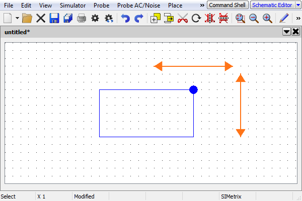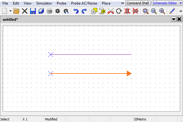 To place a line based annotation, use the menu link, then click on the schematic where you want the annotation to start and drag to where you want the annotation to end. The annotation can be moved by clicking on the annotation then dragging it. One end of the annotation can be moved by rectangle selecting one end, so that a cross is shown on the annotation like in the figure below, then clicking on the cross and dragging it to where you want that end to now be placed.