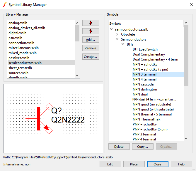 The manager allows you to install or uninstall library files, to move symbols between files or categories, to delete symbols, to copy symbols and to create new categories. You can also create new empty symbols ready for editing with the symbol editor.